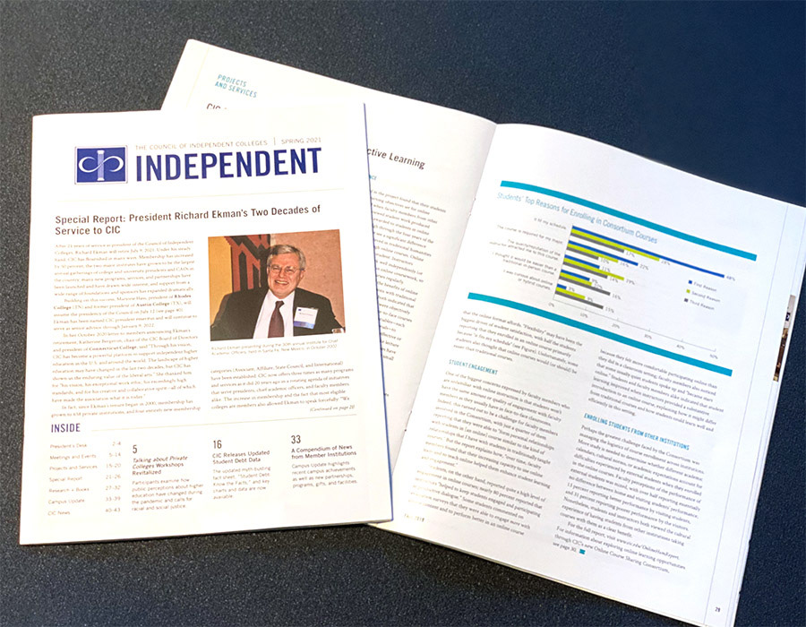 The Council of Independent Colleges publishes a printed newsletter four times per year. I used an already-established InDesign template to layout several printed newsletters for CIC. This is a newsletter I produced in Spring of 2021.