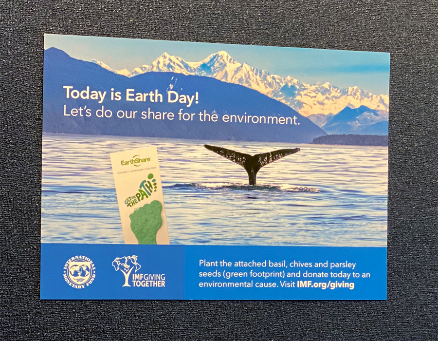 The International Monetary Fund hired me for surge support in 2019, and many of the projects I worked on were internal communications. This postcard encouraged IMF employees to donate to environmental causes.
